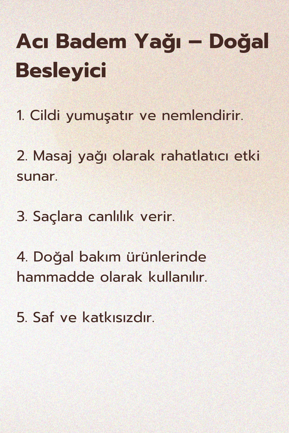 Cilt Sağlığı: Acı bademlerde bulunan E vitamini içeriği, E vitamininin antioksidan özellikleri ve cilt elastikiyetini teşvik etme rolü nedeniyle potansiyel olarak cilt sağlığına katkıda bulunabilir.