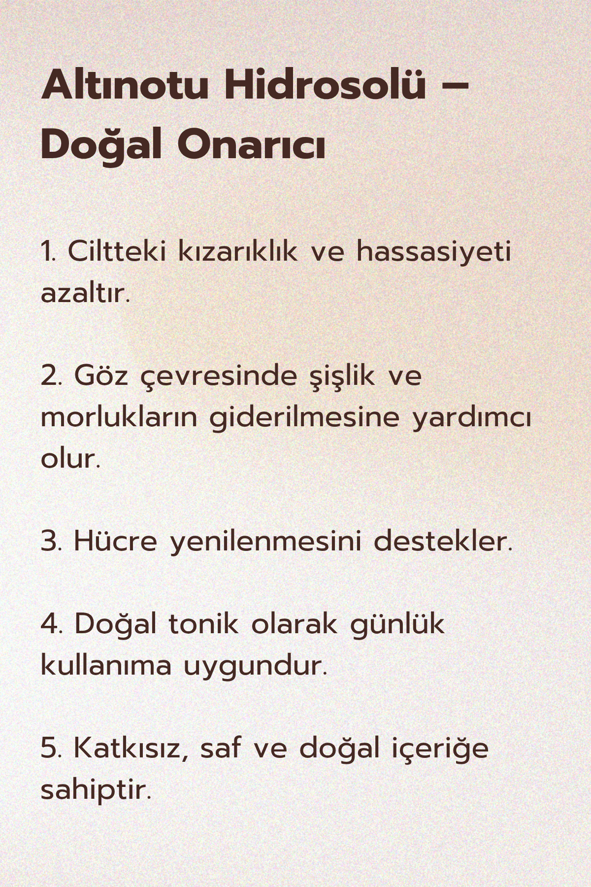 Altınotu Hidrosolü, cildin nem dengesini sağlamada etkili bir tonik olarak kullanılabilir.