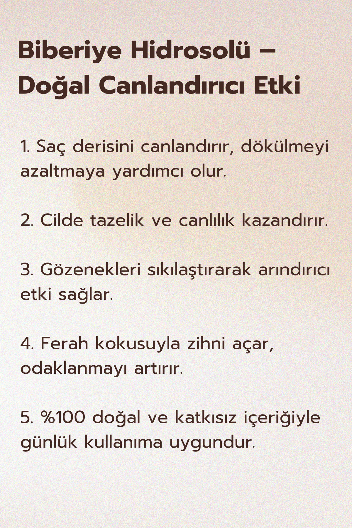 Biberiye hidrosolü, ciltteki yağ dengesini sağlamak için idealdir. Özellikle yağlı ve akneye eğilimli ciltler için faydalıdır. Antibakteriyel ve antifungal özellikleri sayesinde, ciltteki bakteri ve enfeksiyon riskini azaltır. Ayrıca, saç bakımında da kullanılarak saç derisini besler ve saçların sağlıklı bir şekilde uzamasını destekler.