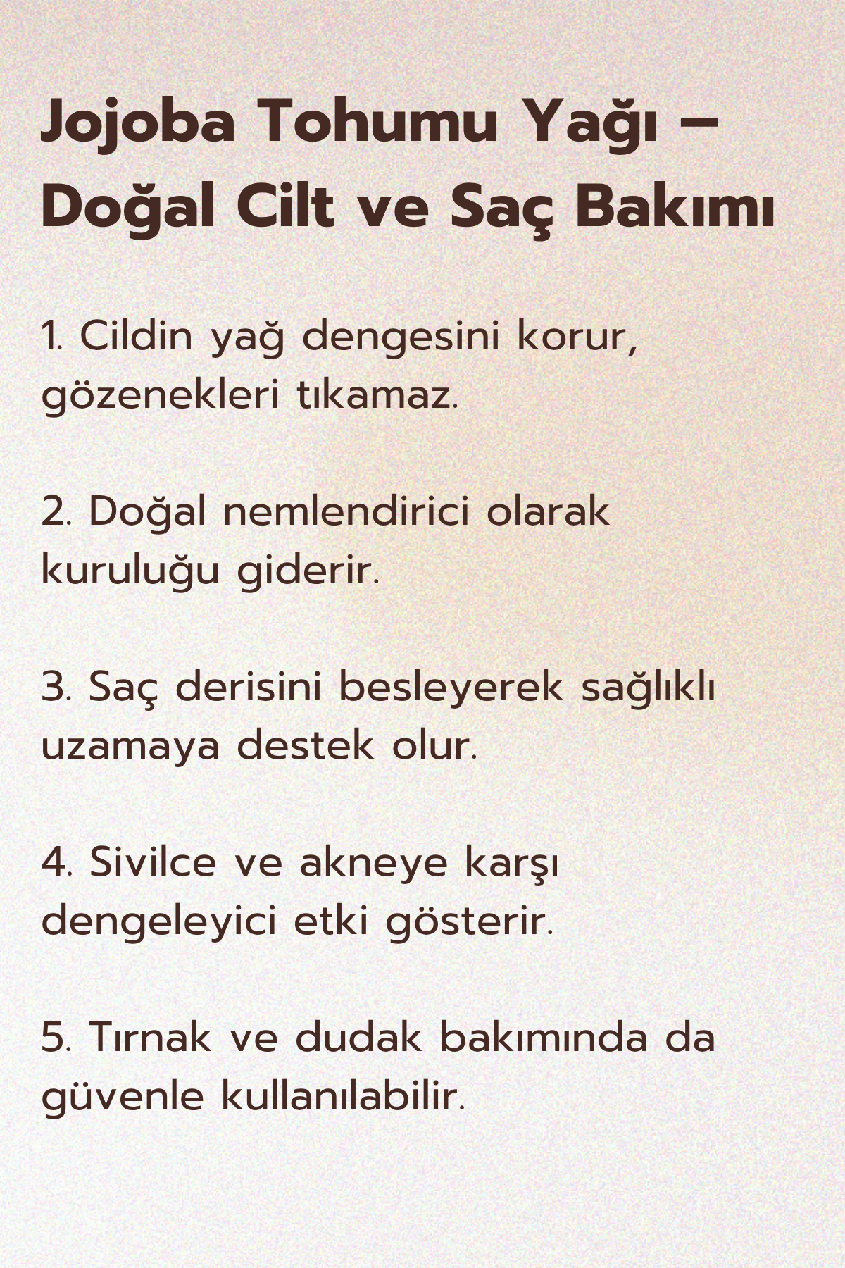 Jojoba tohumu yağı, ciltte hızla emilir ve yağlı bir his bırakmaz. Aynı zamanda anti-inflamatuar özellikleri ile bilinir; bu nedenle sivilce ve diğer cilt irritasyonlarıyla mücadelede yardımcı olabilir. Saç bakımında da kullanılabilen jojoba yağı, saç köklerini besler, saçın sağlıklı görünmesini sağlar ve saçın nemini korur.