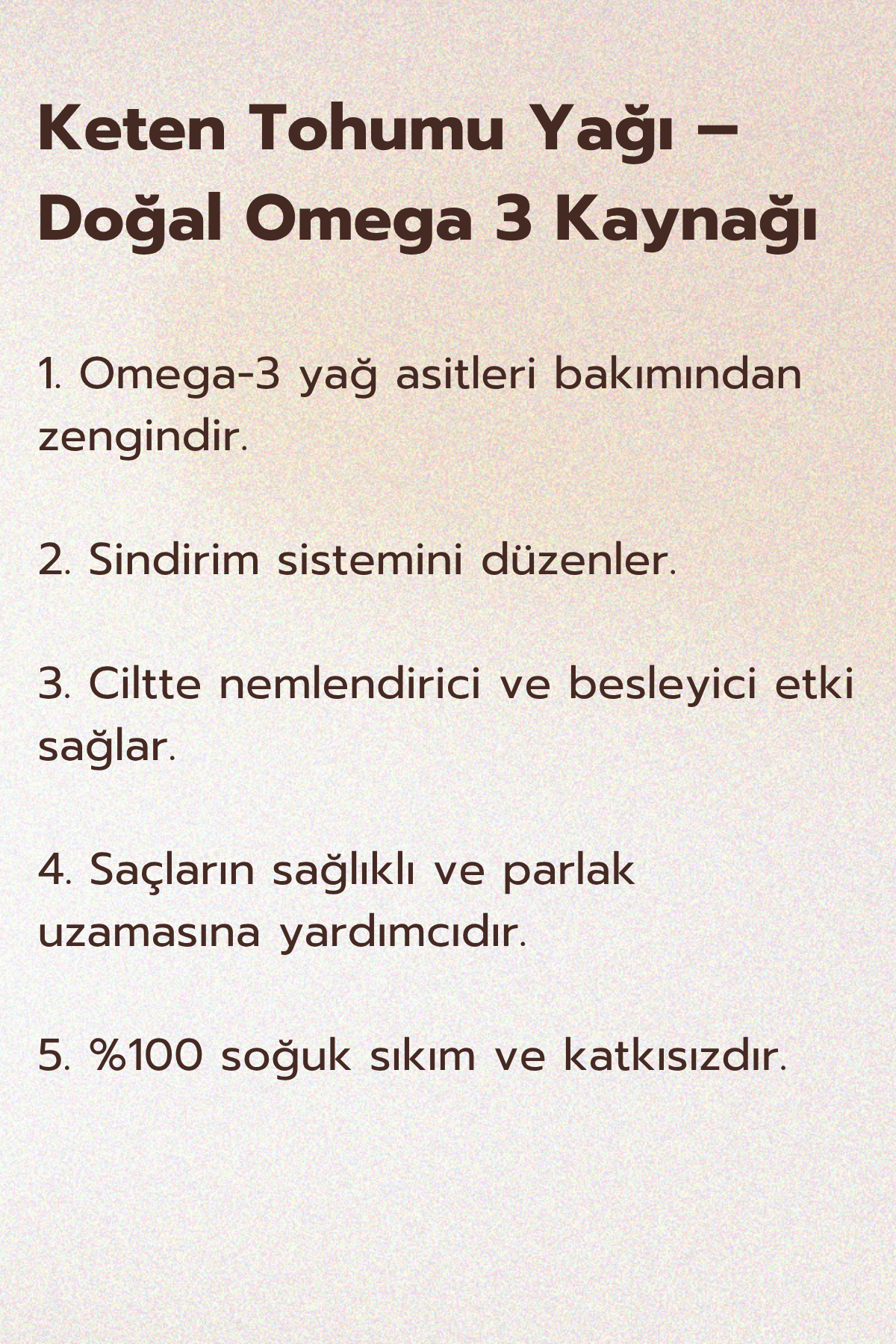 Keten bitkisinin tohumlarından soğuk sıkım yöntemiyle elde edilen zengin bir yağdır.
