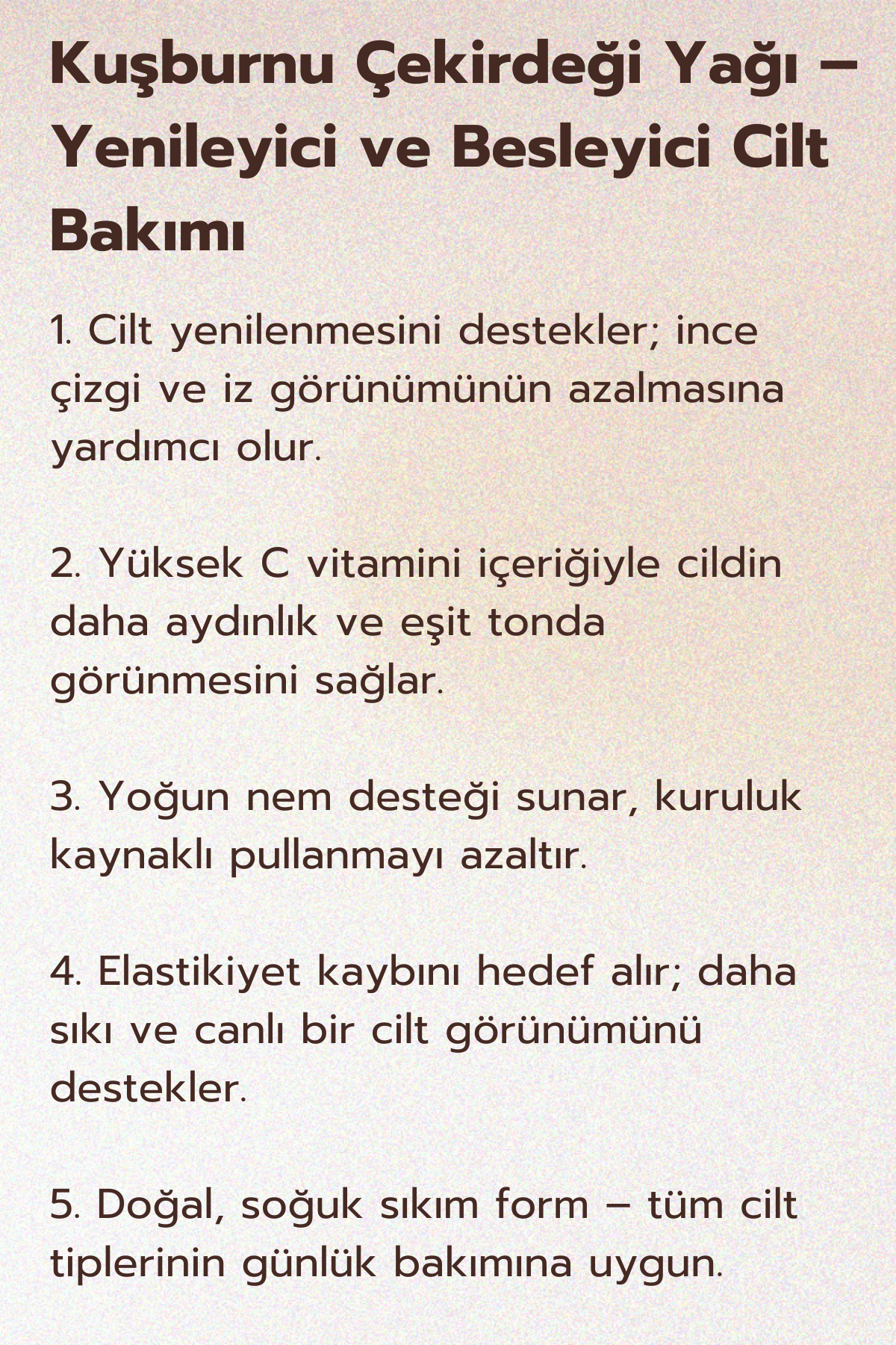 Kuşburnu meyvesinin tohumlarından elde edilen, zengin besin değerlerine sahip bir yağdır. Doğal A vitamini (retinol) ve esansiyel yağ asitleri bakımından zengin olan bu yağ, cilt bakımında yaygın olarak kullanılır. Cildin yenilenmesine ve onarılmasına yardımcı olurken, ince çizgilerin ve kırışıklıkların görünümünü azaltır. Nemlendirici özellikleri sayesinde kuru ciltleri besler ve cildin elastikiyetini artırır. Ayrıca ciltteki renk eşitsizliklerini gidermeye yardımcı olur.