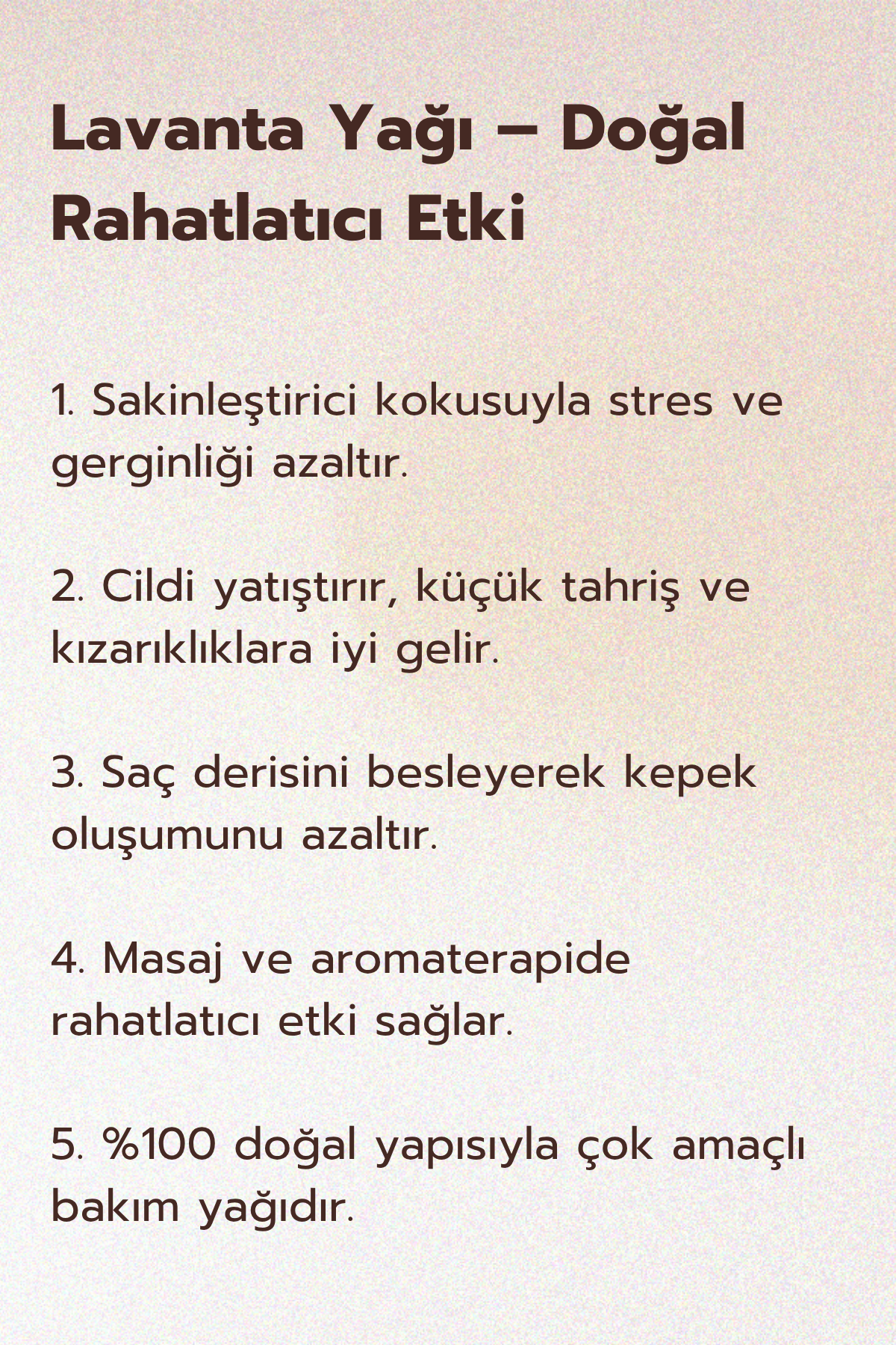 Bu yağ, rahatlatıcı ve sakinleştirici özellikleriyle bilinir, bu da stres ve anksiyete yönetiminde etkili olmasına yardımcı olur. Lavanta yağı, uyku kalitesini artırmak ve rahatlatıcı bir atmosfer yaratmak için sıklıkla kullanılır.
