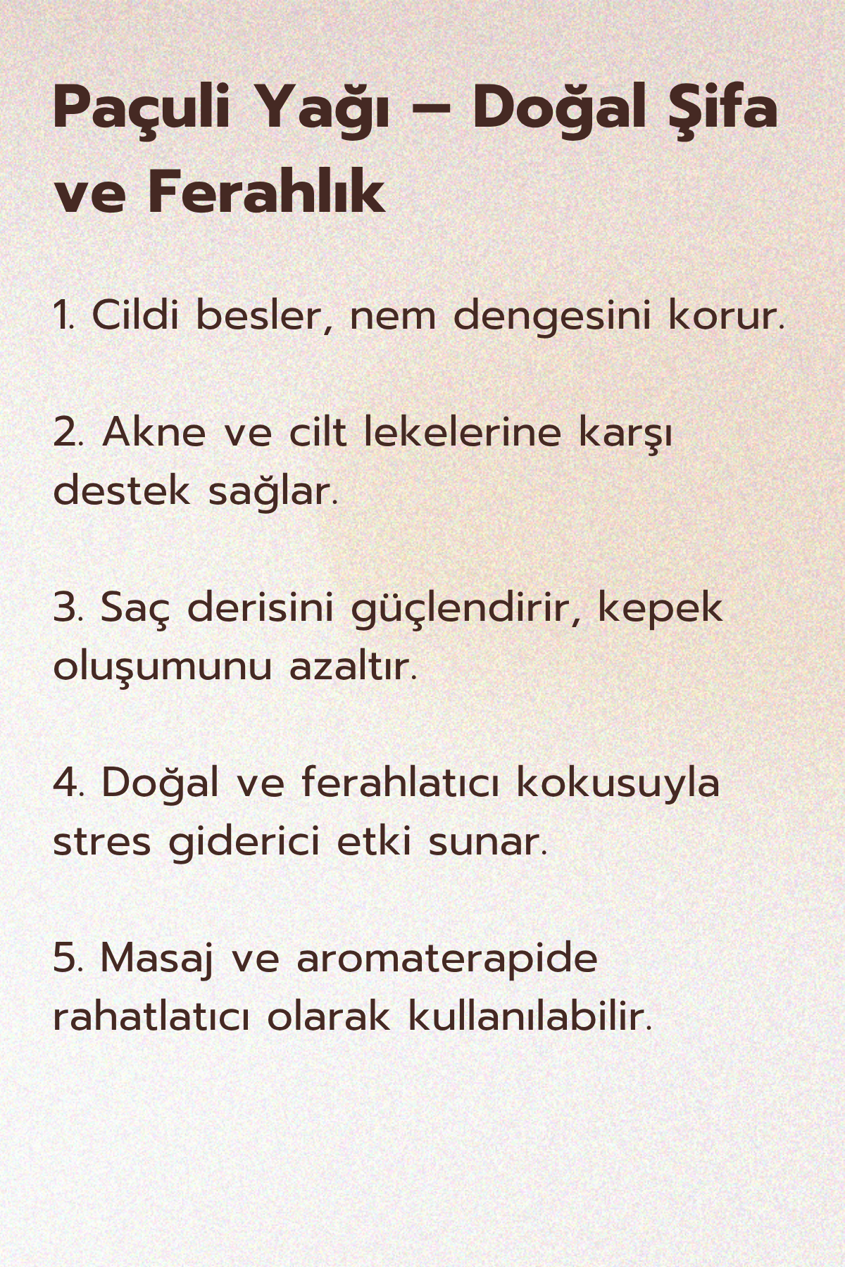 Münire Hatun Paçuli Yağı, cildin yağ dengesini sağlamaya yardımcı olurken, nemlendirici özellikleri sayesinde kuru ciltler için de uygundur. Paçuli yağı, aynı zamanda doğal bir parfüm ve deodorant olarak da kullanılabilir, bu sayede hoş bir koku sağlayarak ruh halini iyileştirir.
